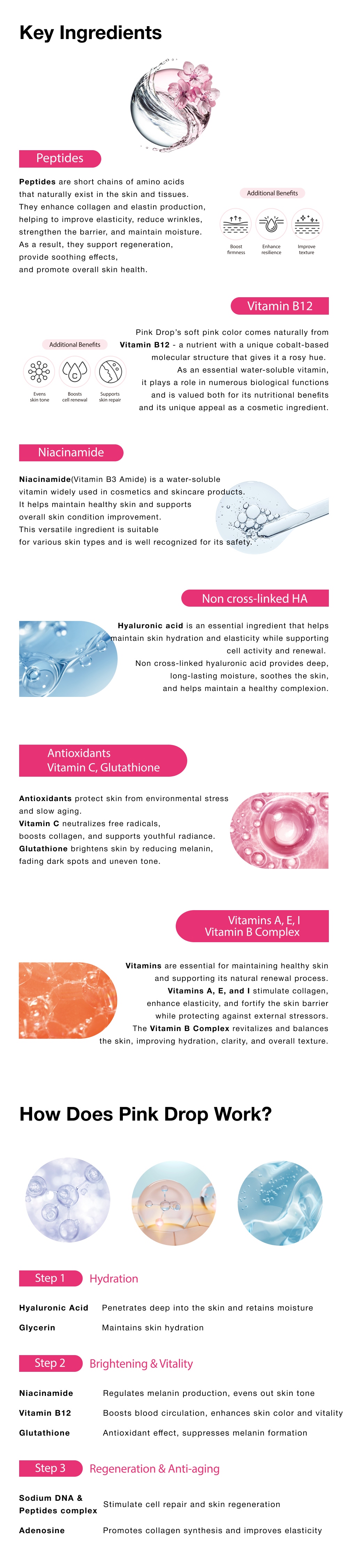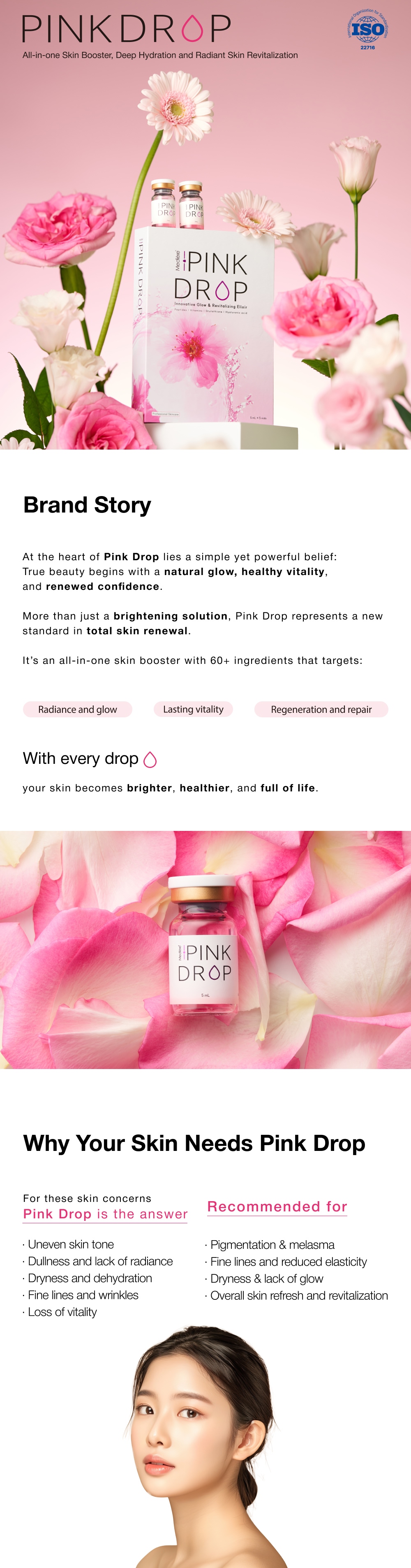 Pink Drop is an all-in-one skin booster that revitalizesdull, tired skin by deeply hydrating, brightening, andrestoring its natural glow for a healthier, more radiantcomplexion.