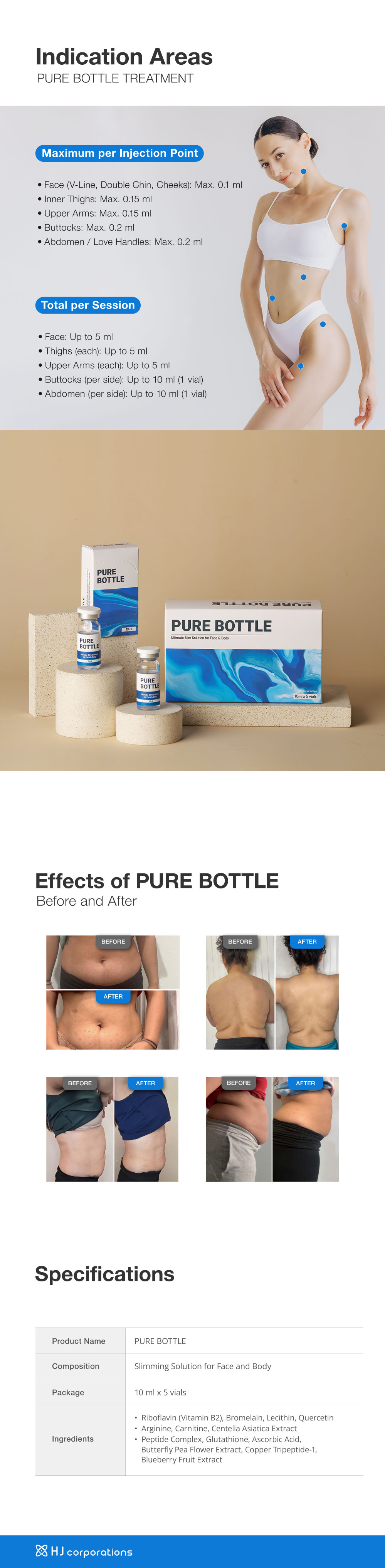 PURE BOTTLE is a premium fat-dissolving solution, formulated with high-purity active ingredients for optimal results.