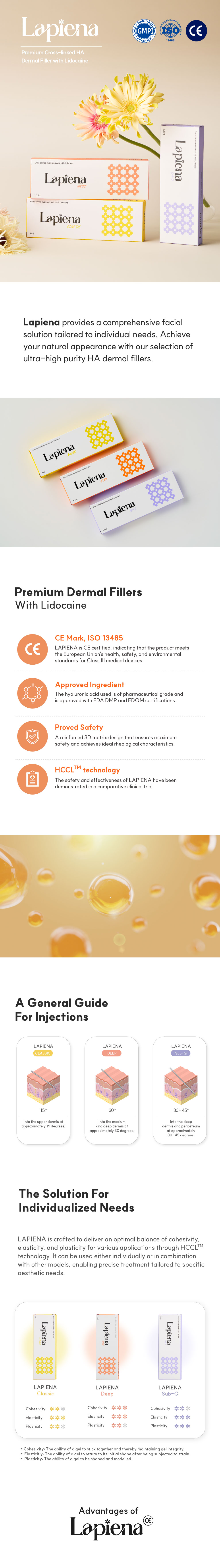 Lapiena is a premium HA filler with lidocaine that boosts elasticity, restores volume, and smooths wrinkles for firmer, younger-looking skin.